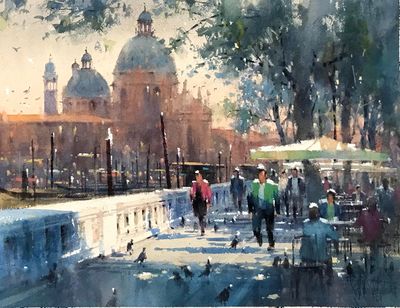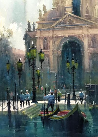 回台北後,身心馬上恢復日常創作水彩狀態,翻開我帶去台南的草稿本,很多新鮮的構圖都想立刻完成,非常興奮,挑了一個最想先畫的構圖來開始 ! 創作這件作品過程中,台灣疫情爆發,忽然的人數暴增,感受到病毒對生命無情威脅的恐懼。這件作品"大運河旁",題材是威尼斯最大的教堂,安康聖母院。當時黑死病疫情過後,威尼斯建造了這座教堂獻給聖母,感謝聖母保佑讓傳染病結束。教堂原名"salute",有健康與救贖的意思。